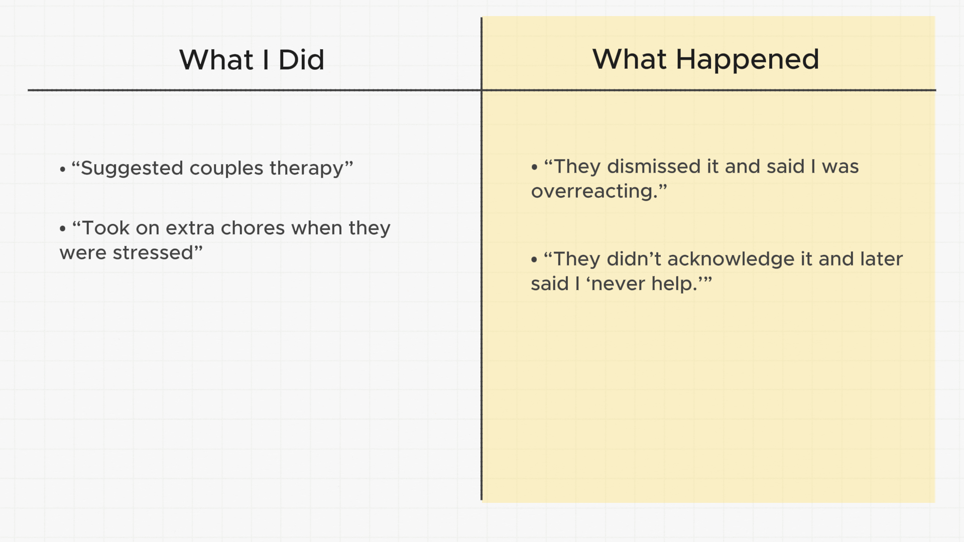 What Happened: “They dismissed it and said I was overreacting.” - What I Did: “Took on extra chores when they were stressed”