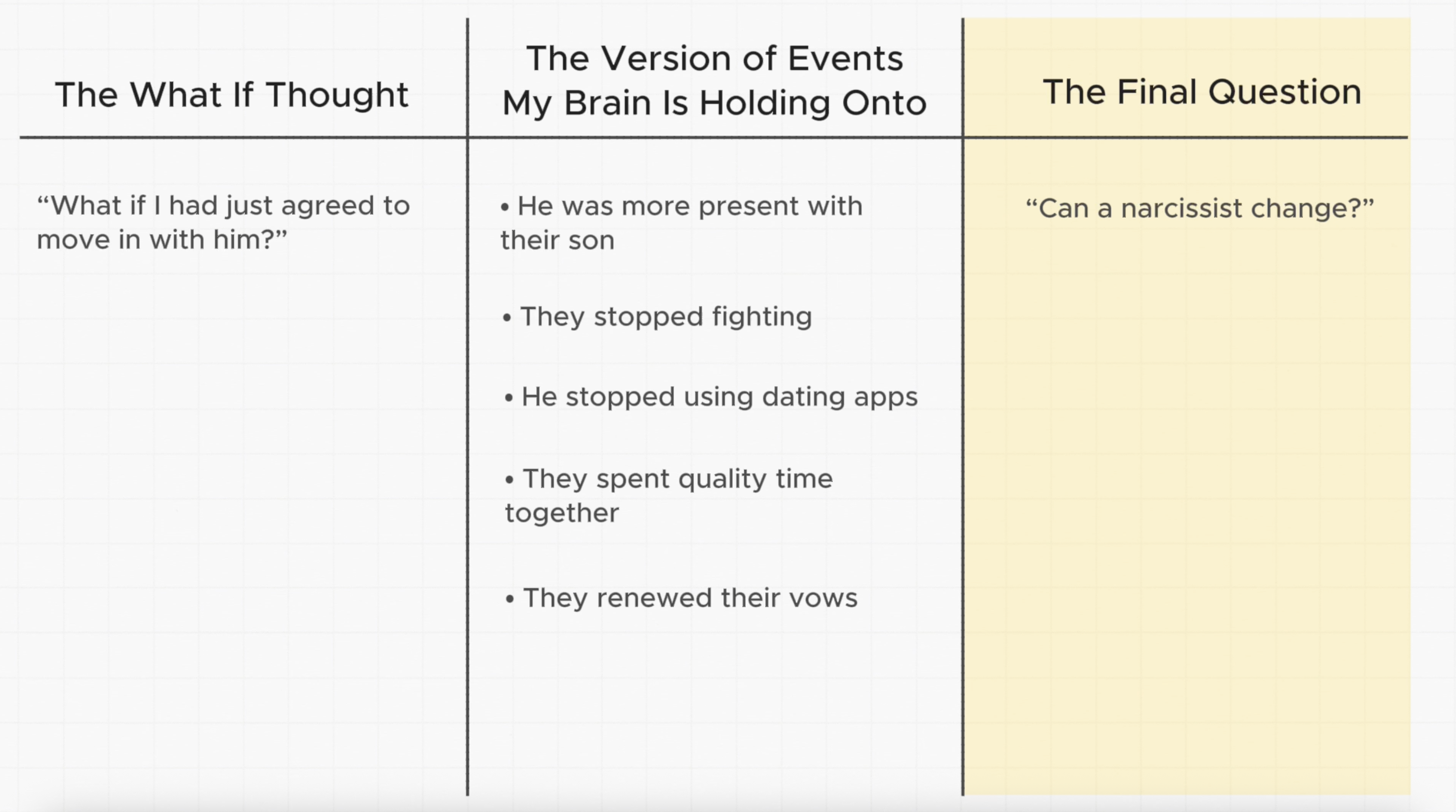 To do this, a woman we’re working with wrote out the future she expected to have with her ex, and then next to it, a clear reason why it wasn’t going to happen.