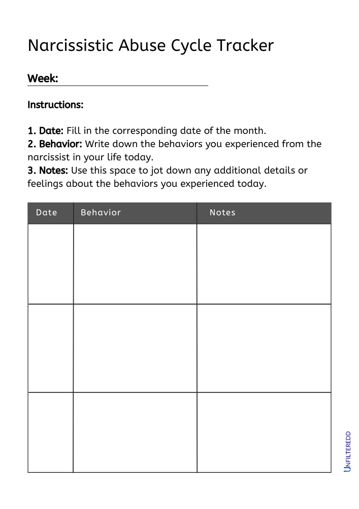 The goal is simple: keep track of how the narcissist tries to pull you back every day. By doing this daily, you’ll start seeing their patterns, making it easier to protect yourself.